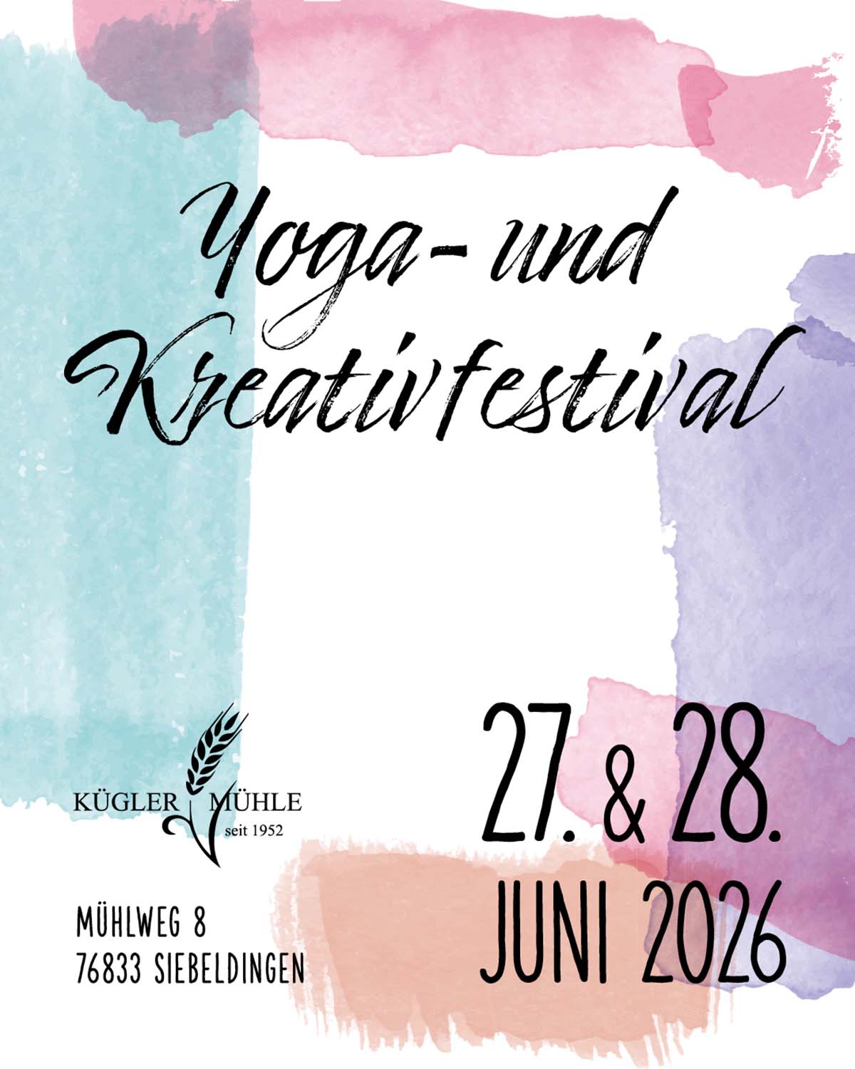 - Yoga & Kreativfestival am 27.06 und 28.06.2026: das Festival für Kreativität, Yoga und einer Auszeit für Dich! Hier ein kurzer Überblick was wir vor haben: